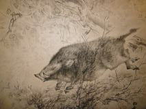 ![]() 当社本殿に置いている衝立に描かれている山から下りてくる猪。 |